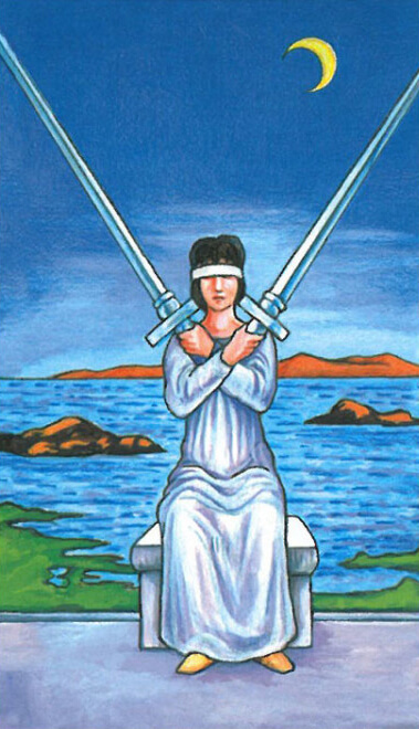身穿浅灰长袍的女人坐在灰石凳上,背对着澎湃汹涌、暗礁满布的海洋。她眼蒙白布,双手持剑,在胸前交叉不动。天际高挂一轮新月。女人身后的水面代表感情,她不仅背对感情,还布蒙双眼,表现出全然的逃避与困惑。此举如同掩耳盗铃,其实后面的汹涌海面、密布礁石与多变新月,早已彻底显露她的内心情感,而她选择蒙上眼睛,背对不看。宝剑二也是一张有关决定的牌,表示当事人做不出决定,或拒绝决定。她双手持剑,交叉在胸前,形成一种抗拒的姿态。这也意味着她有颗封闭的心灵。无论遇到何人何事,她总会两手交叉,大声说No!她宁愿否定—切,也不愿打开心扉。女人静坐不移,两把宝剑亦斜立不动,互相对立,形成僵局。这两把剑好象两股势力,彼此对峙许久,却毫无动静,没有一方率先打破沉默。因此,宝剑二经常表示双方闹僵、对峙与冷战,有点像是两个国家都有核武,却没人先动手的这种「恐怖平衡」与「假性和平」。