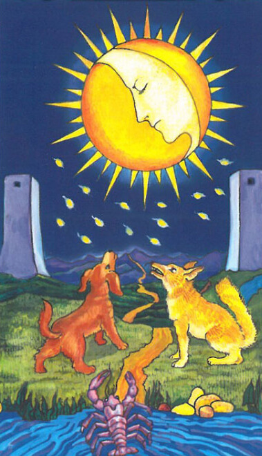 The moon hangs high in the night sky, waxing and waning. There is a sad face on the moon, which makes people feel depressed and uneasy. There are two dogs (some say it is a wolf and a dog) beside the moon, looking up at the moon and howling, as if they feel the moon's sadness and sympathize with it, or asking for something from the moon. The scorpion in the pool seems to yearn for the moon palace, trying to climb out of the water and is about to follow the yellow curved path to the place he has longed for. Except for the moon and the scorpion, the whole card picture is basically symmetrical, separated by a winding blind, which is said to represent the ideal and reality of life. In order to realize his dream, the scorpion must wander between the ideal and reality. It is difficult to achieve the goal if there is a slight deviation. The sad and uneasy face on the moon seems to be a reflection of the scorpion's heart as he moves forward!